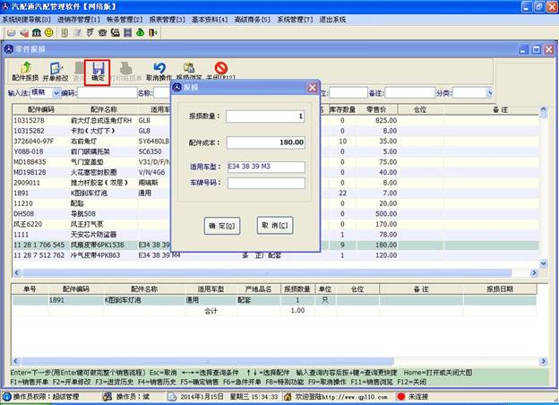 打開配件報損窗口,找到要報損的配件,雙擊,輸入報損數(shù)量點確定,最后再點擊下圖標記出來的“確定”按鈕,在彈出來的報損編輯窗口中輸入相關信息。