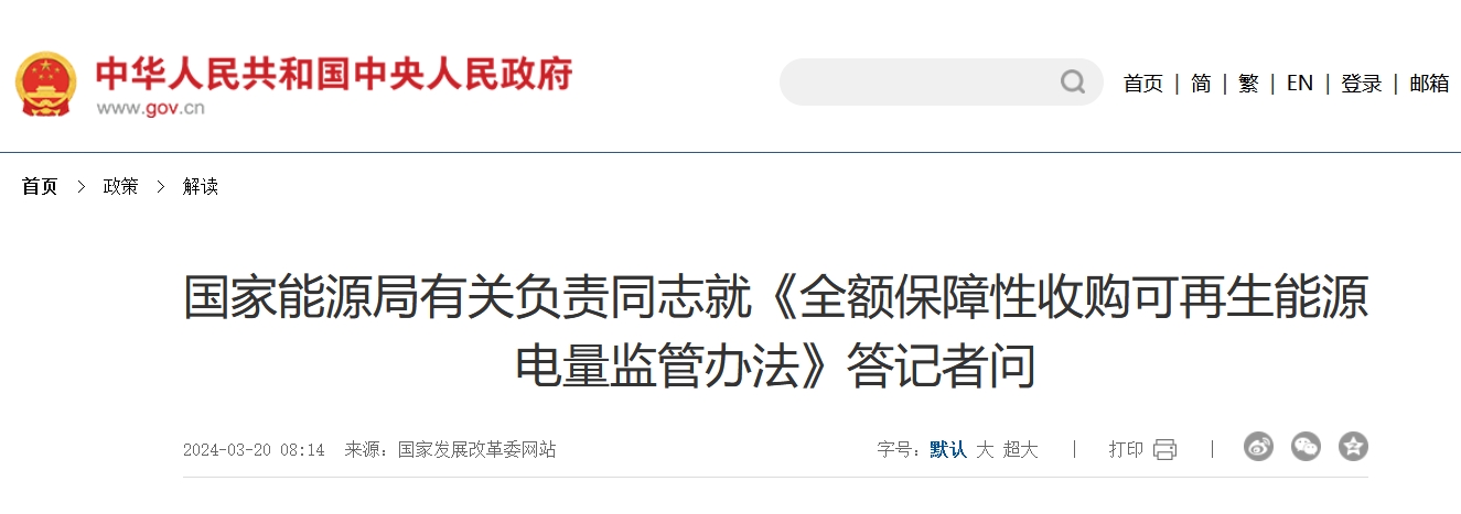 國家能源局有關(guān)負(fù)責(zé)同志就《全額保障性收購可再生能源電量監(jiān)管辦法》答記者問國家發(fā)展改革委于印發(fā)了《全額保障性收購可再生能源電量監(jiān)管辦法》(以下簡稱《辦法》),國家能源局有關(guān)負(fù)責(zé)同志接受采訪,回答了記者提問?! 枺骸掇k法》印發(fā)的背景是什么? 答:原國家電力監(jiān)管委員會于2007年9月1日印發(fā)施行《電網(wǎng)企業(yè)全額收購可再生能源電量監(jiān)管辦法》(國家電力監(jiān)管委員會令第25號),有效規(guī)范可再生能源電量保障收購行為,為推動可再生能源規(guī)?;】蛋l(fā)展,實(shí)現(xiàn)清潔低碳發(fā)展目標(biāo)發(fā)揮了重要作用查看詳情>>