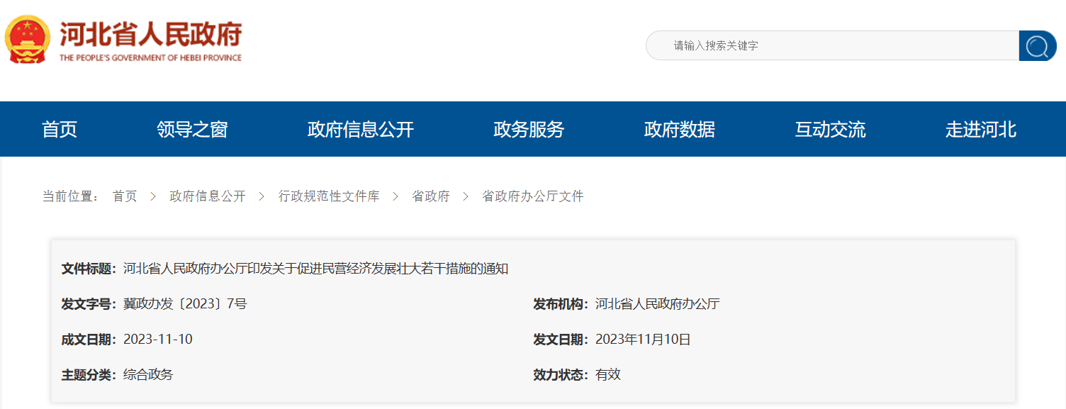 河北省人民政府辦公廳印發(fā)關(guān)于促進(jìn)民營(yíng)經(jīng)濟(jì)發(fā)展壯大若干措施的通知河北省人民政府辦公廳印發(fā)關(guān)于促進(jìn)民營(yíng)經(jīng)濟(jì)發(fā)展壯大若干措施的通知各市(含定州、辛集市)人民政府,雄安新區(qū)管委會(huì),省政府各部門: 《關(guān)于促進(jìn)民營(yíng)經(jīng)濟(jì)發(fā)展壯大的若干措施》已經(jīng)省政府同意,現(xiàn)印發(fā)給你們,請(qǐng)結(jié)合實(shí)際認(rèn)真貫徹落實(shí)。 河北省人民政府辦公廳2023年11月10日關(guān)于促進(jìn)民營(yíng)經(jīng)濟(jì)發(fā)展壯大的若干措施 為進(jìn)一步優(yōu)化民營(yíng)經(jīng)濟(jì)發(fā)展環(huán)境,促進(jìn)民營(yíng)經(jīng)濟(jì)持續(xù)做大做優(yōu)做強(qiáng),根據(jù)《中共中央國(guó)務(wù)院關(guān)于促進(jìn)民營(yíng)查看詳情>>