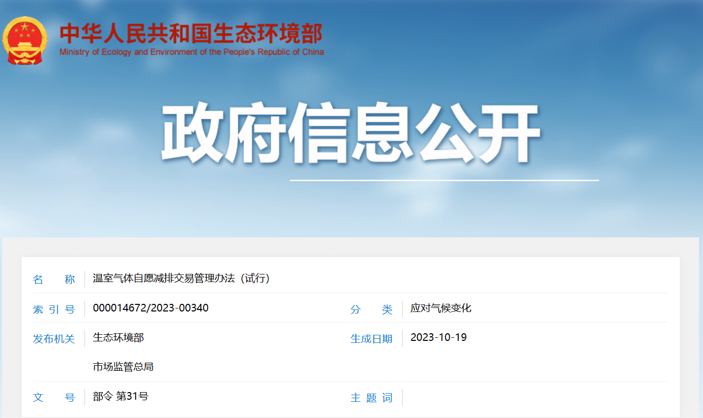 生態(tài)環(huán)境部發(fā)布:溫室氣體自愿減排交易管理辦法(試行)溫室氣體自愿減排交易管理辦法(試行) 《溫室氣體自愿減排交易管理辦法(試行)》已于2023年9月15日由生態(tài)環(huán)境部2023年第三次部務(wù)會(huì)議審議通過(guò),并經(jīng)國(guó)家市場(chǎng)監(jiān)督管理總局同意,現(xiàn)予公布,自公布之日起施行?! ∩鷳B(tài)環(huán)境部部長(zhǎng) 黃潤(rùn)秋 市場(chǎng)監(jiān)管總局局長(zhǎng) 羅文 2023年10月19日溫室氣體自愿減排交易管理辦法(試行)第一章 總 則 第一條為了推動(dòng)實(shí)現(xiàn)我國(guó)碳達(dá)峰碳中和目標(biāo),控制和減少人為活動(dòng)產(chǎn)查看詳情>>